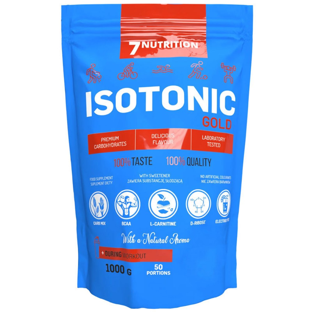 7Nutrition - ISOTONIC Gold - 1000 g to suplement uzupełniający dietę w kompleks węglowodanów, elektrolity (minerały), witaminę C oraz aminokwasy (BCAA), L-karnitynę i D-rybozę.