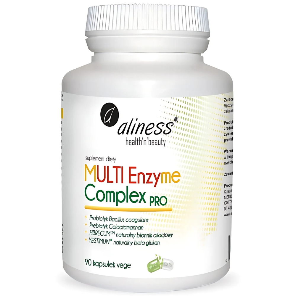 Aliness MULTI Enzyme Complex PRO to zaawansowany suplement diety zawierający kompleks enzymów trawiennych, probiotyk i prebiotyk, wspierający zdrowie układu pokarmowego.