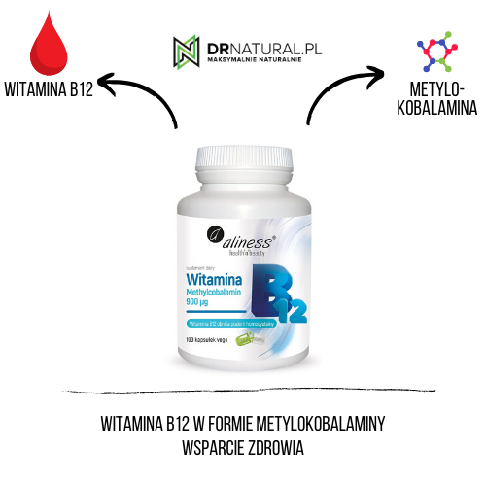 Aliness - Witamina B12 Methylcobalamin - 100 kapsułek to suplement diety będący źródłem aktywnej witaminy B12, czyli metylokobalaminy.
