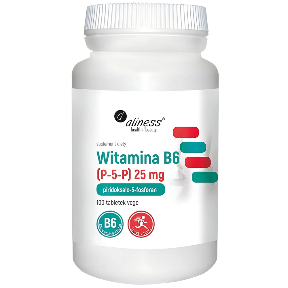 Aliness - Witamina B6 (P-5-P) 25 mg - 100 tabletek to suplement diety będący źródłem witaminy B6 w koenzymatycznej formie P-5-P.