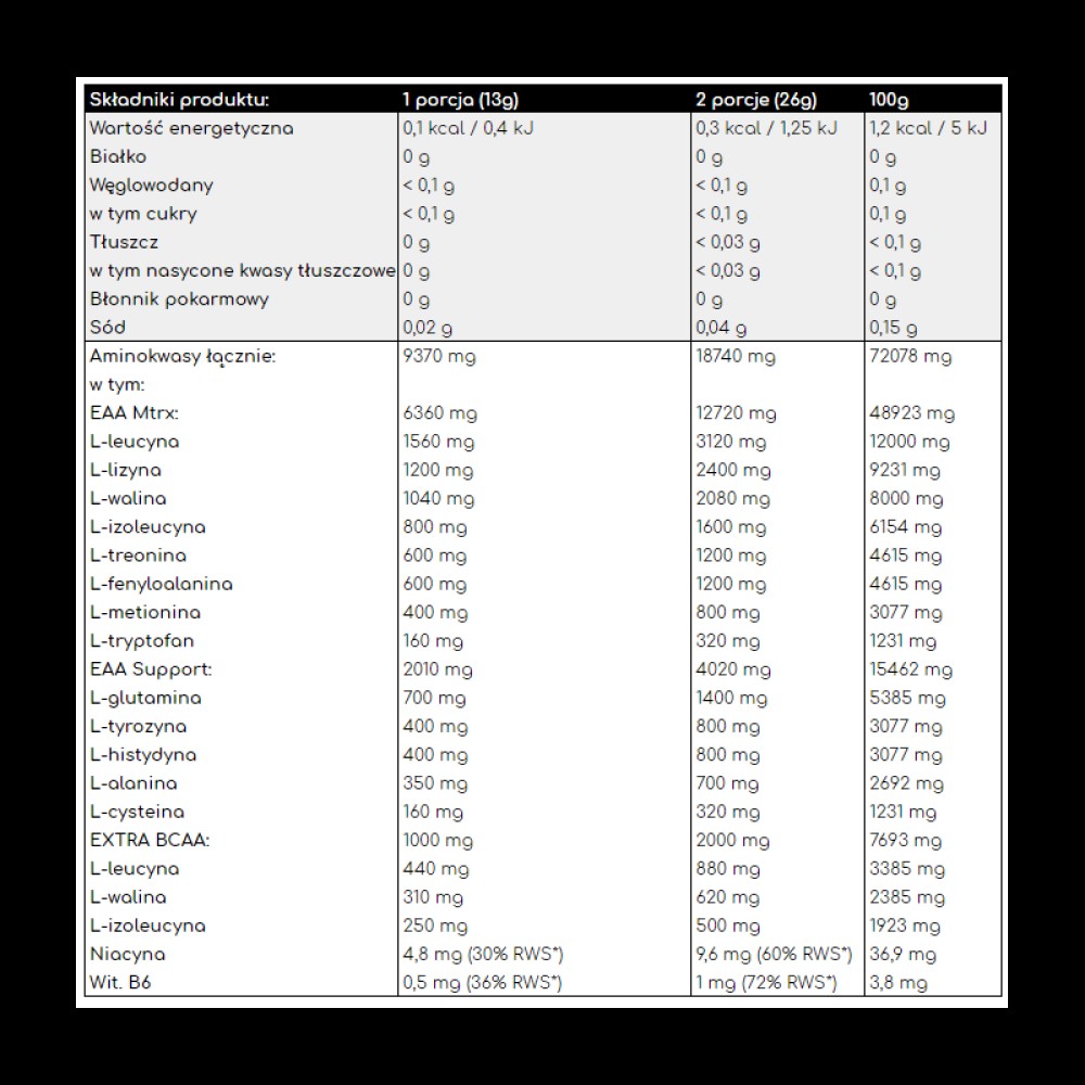 Składniki: EAA mtrx [L-leucyna, chlorowodorek L-lizyny, L-walina, L-izoleucyna, L-treonina, L-fenyloalanina, L-metionina, L-tryptofan], EAA Support [L-glutamina, L-tyrozyna, chlorowodorek L-histydyny, L-alanina, cystyna (jako źródło L-cysteiny)], EXTRA BCAA [L-leucyna, L-walina, L-izoleucyna], nikotynamid – niacyna, chlorowodorek pirydoksyny - wit. B6; guma arabska – substancja zagęszczająca; kwas jabłkowy, kwas cytrynowy, cytrynian sodu – regulatory kwasowości; aromaty, acesulfam K, sukraloza – substancje słodzące.