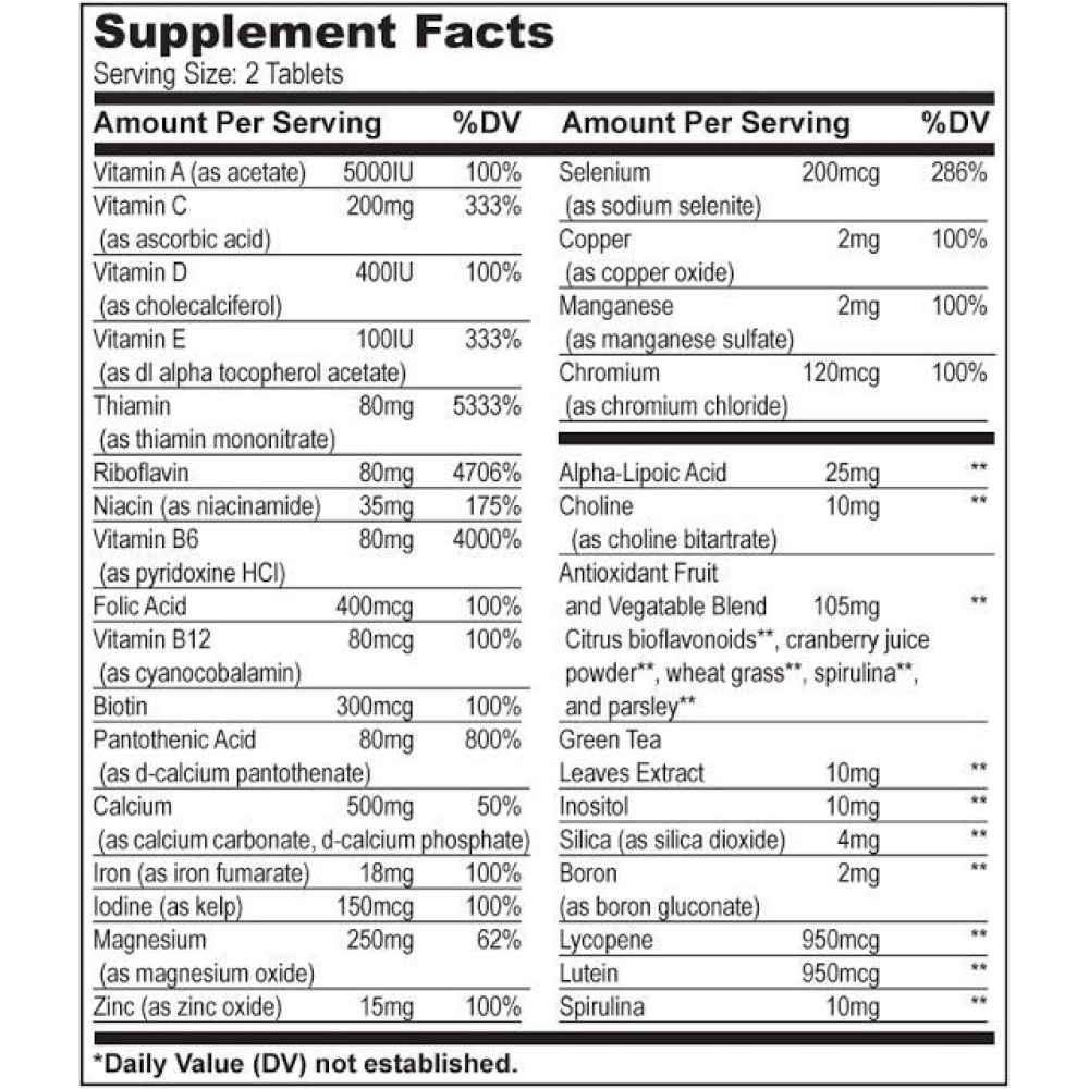 Składniki: fosforan diwapnia, tlenek magnezu, kwas askorbinowy, octan DL-alfa tokoferylu, celuloza mikrokrystaliczna (substancja wypełniająca), hydroksypropyl-metylo celuloza (substancja wypełniająca), azotan tiaminy, chlorowodorek pirydoksyny, pantotenian D-wapnia, ryboflawina, fumaran żelaza, cytrynian boru, niacynamid, stearynian magnezu (substancja przeciwzbrylająca), kwas stearynowy (substancja przeciwzbrylająca), winian choliny, Citrus aurantium (100% owoców),kwas alfa liponowy, trawa przeniczna (100% rośliny, Triticum aestivum 10:1), spirulina, Petroselinum crispum (całą roślina, 10:1), owoce żurawiny (Vaccinum macrocarpon, 10:1), tlenek cynku, octan retinylu, inozytol, ekstrakt z liści zielonej herbaty (Camellia sinesis), dwutlenek krzemu, siarczan miedzi, siarczan manganu, cholekalcyferol, likopen, luteina, chlorek chromu, selenian sodu, kwas foliowy, biotyna, jodek potasu, cyjanokobalamina.