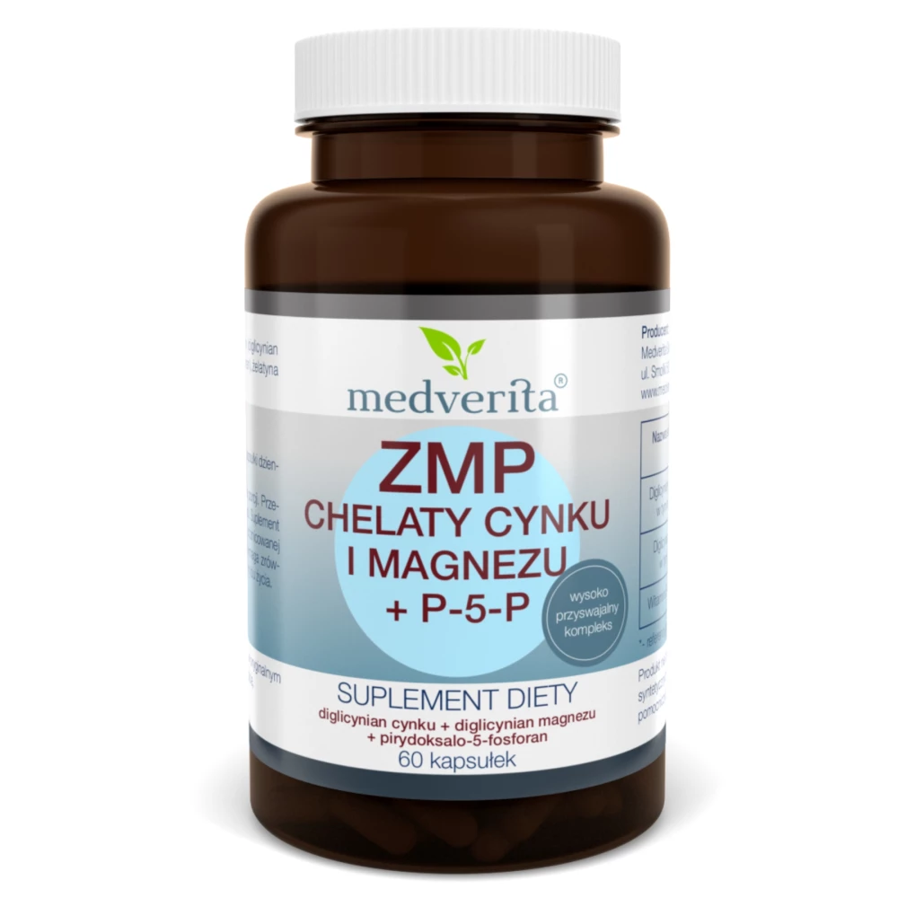 Medverita - ZMP chelaty Cynku i Magnezu + P-5-P - 60 kapsułek to suplement diety łączący w sobie kompleks chelatów aminokwasowych cynku i magnezu z P-5-P.