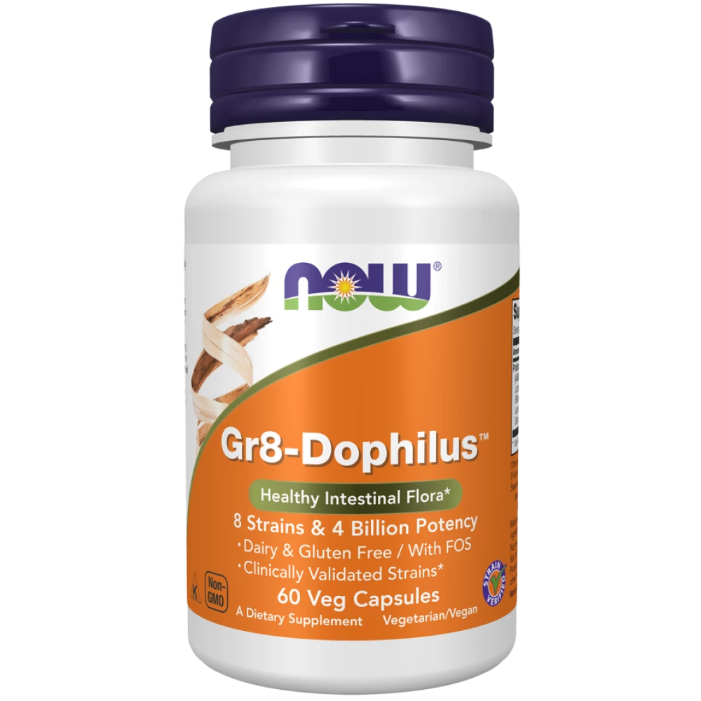 NOW - Gr8-Dophilus - 60 kapsułek to suplement probiotyczny zawierający aż 8 szczepów bakterii probiotycznych. Łączna ilość żywych organizmów w każdej kapsułce wynosi aż 4 miliardy CFU. Probiotyk ten stanowi idealne uzupełnienie diety w deficytowe bakterie probiotyczne.