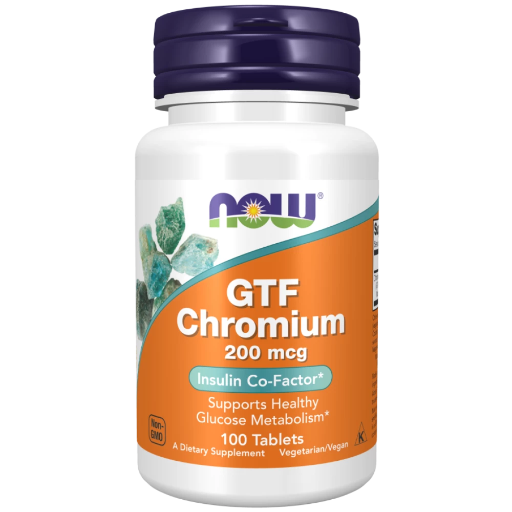NOW - GTF Chromium 200 mcg - 100 tabletek to suplement diety zawierający chrom GTF. Głównym działaniem tego pierwiastka jest wsparcie gospodarki cukrowej poprzez wpływ na prawidłowy poziom glukozy we krwi. Dodatkowo chrom przyczynia się do utrzymania prawidłowego metabolizmu makroskładników odżywczych, co wskazuje jak dobrze ten pierwiastek komponuje się ze zbilansowaną dietą.