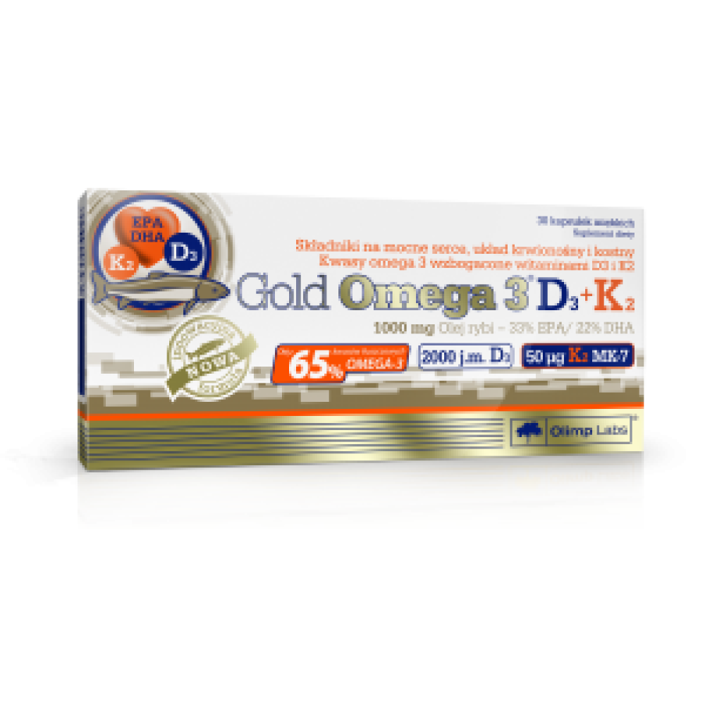 Gold Omega 3® D3 + K2 to suplement diety o wysokiej zawartości kwasów tłuszczowych omega-3, uzupełniony o wysoką ilość naturalnej witaminy K z natto, występującej w najbardziej przyswajalnej i najaktywniejszej formie – menachinonu 7 (witamina K2). Produkt zawiera również witaminę D3 na poziomie aż 2000 j.m.