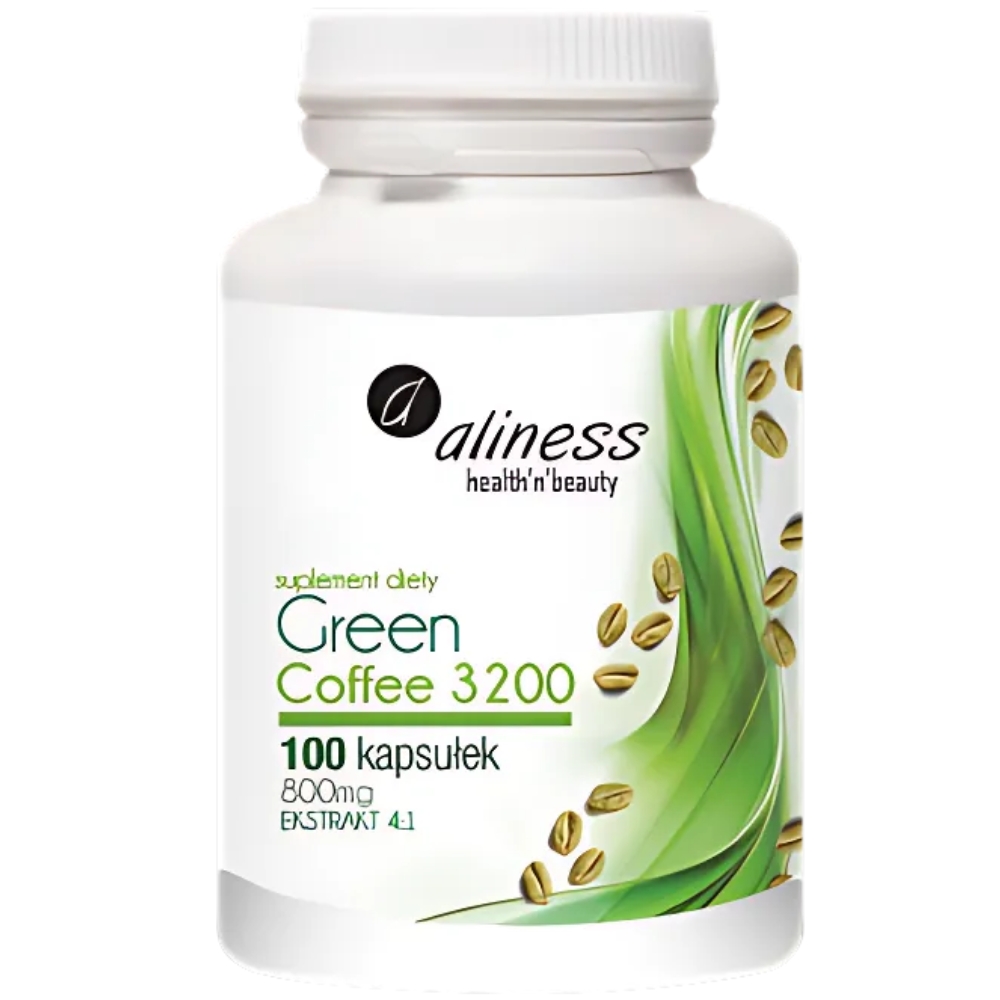 Aliness - Zielona kawa Green Cofee 3200 - 100 kapsułek to suplement diety zawierający 800 mg ekstraktu z ziaren zielonej kawy.