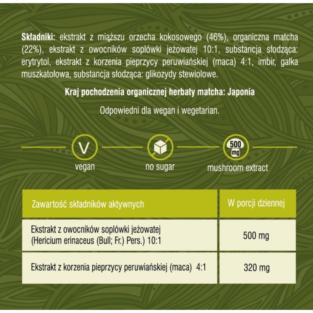Składniki: Ekstrakt z miąższu orzecha kokosowego (46%), organiczna matcha (22%), ekstrakt z owocników Soplówki jeżowatej 10:1, substancja słodząca: erytrytol, ekstrakt z korzenia pieprzycy peruwiańskiej (Maca) 4:1, imbir, gałka muszkatołowa, substancja słodząca: glikozydy stewiolowe.