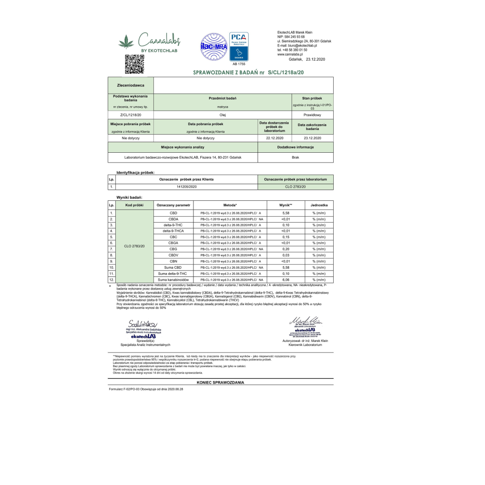Składniki: ekstrakt z kwiatostanów konopi siewnych.